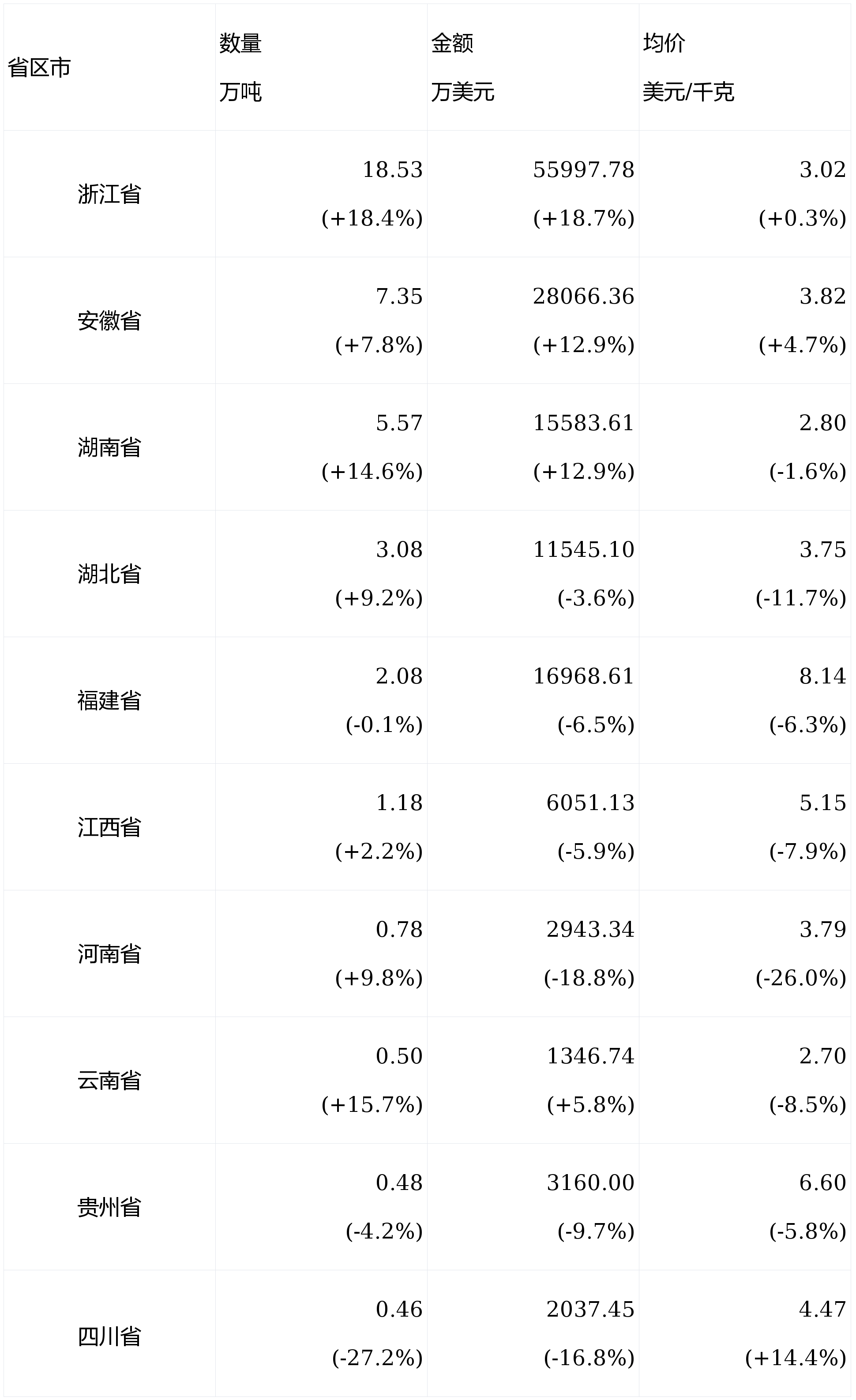 茶叶出口省区市位居前10位的区分是浙江省、安徽省、湖南省、湖北省、福修省、江西省、河南省、云南省、贵州省、四川省。浙江省出口量(18.53万吨)、金额(55997.78万美元)同比增幅最大,区分达18.4%和18.7%;四川省出口量(0.46万吨)和出口额(2037.45万美元)同比降幅最大,区分达27.2%和16.8%。