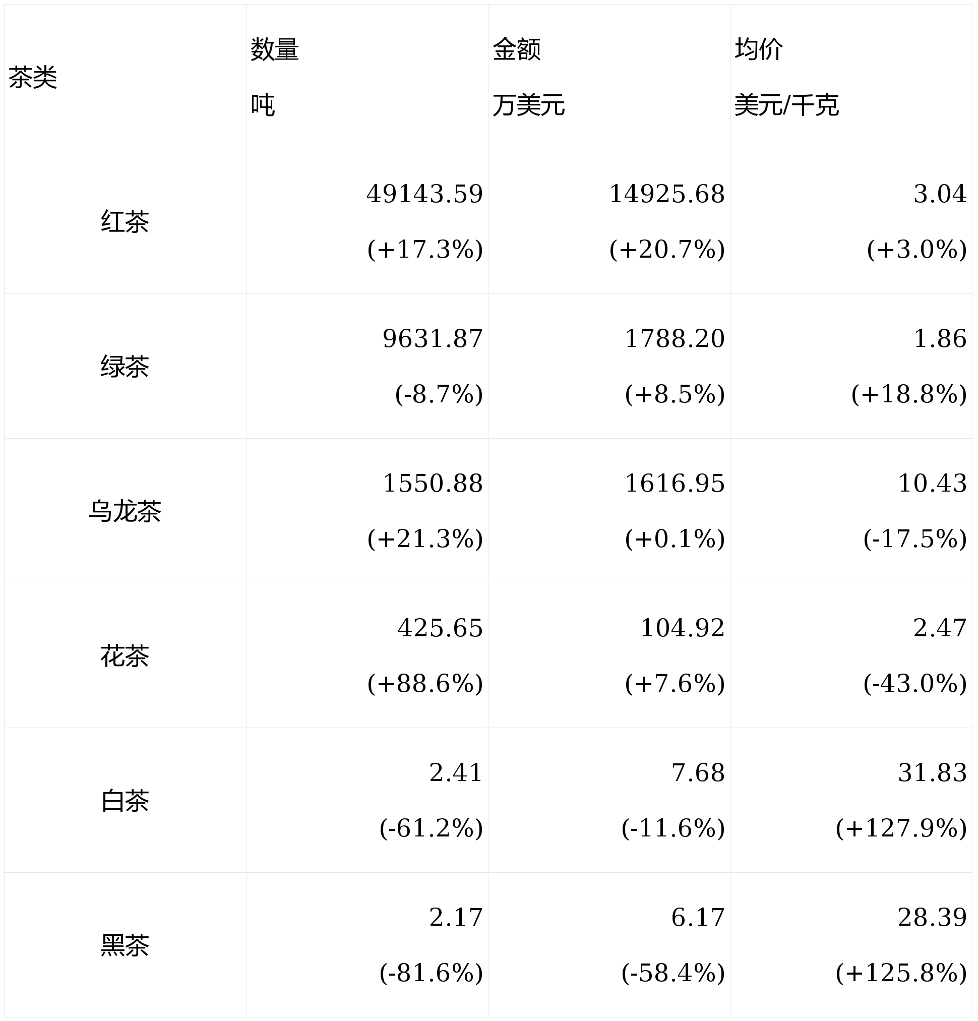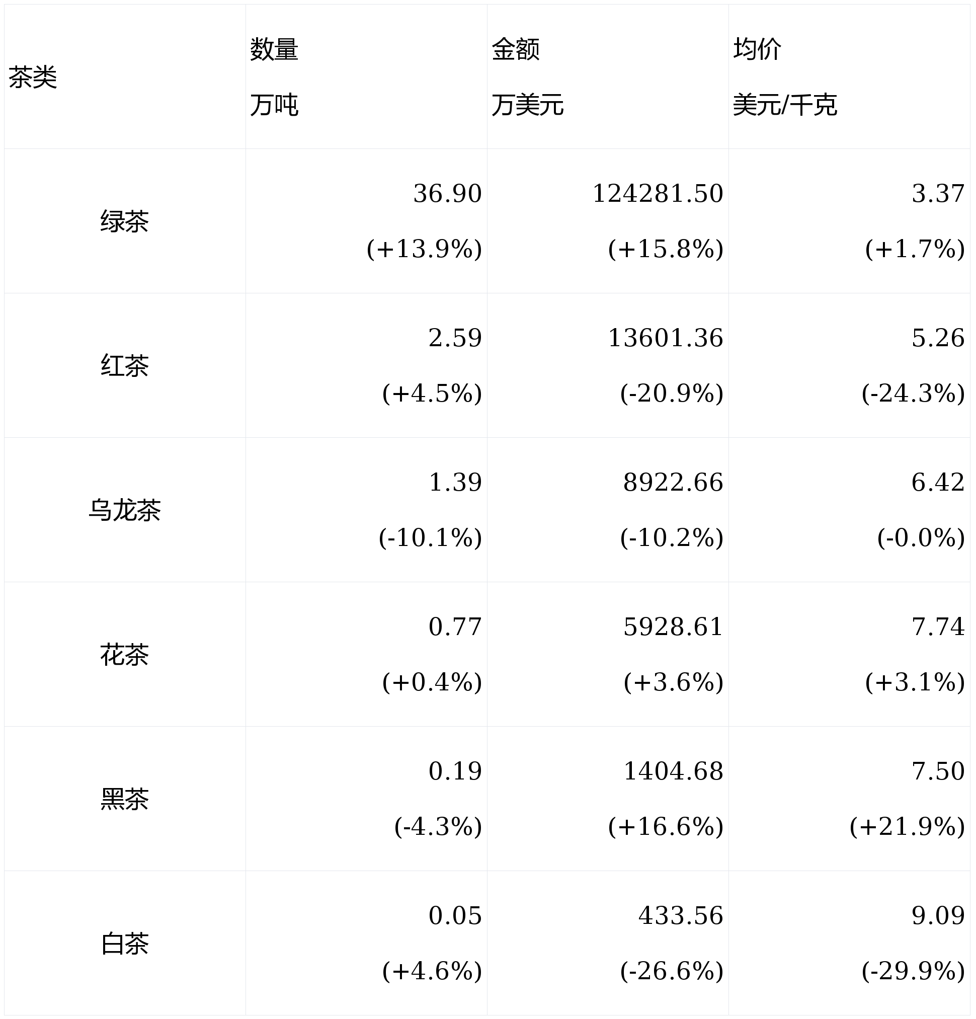 各茶类中绿茶(36.90万吨)、红茶(2.59万吨)、花茶(0.77万吨)、白茶(0.05万吨)出口量呈同比拉长态势,绿茶增幅最大约13.9%。乌龙茶(1.39万吨)、黑茶(0.19万吨)出口量呈同比低落趋向,乌龙茶出口量同比降幅最大,达10.1%。