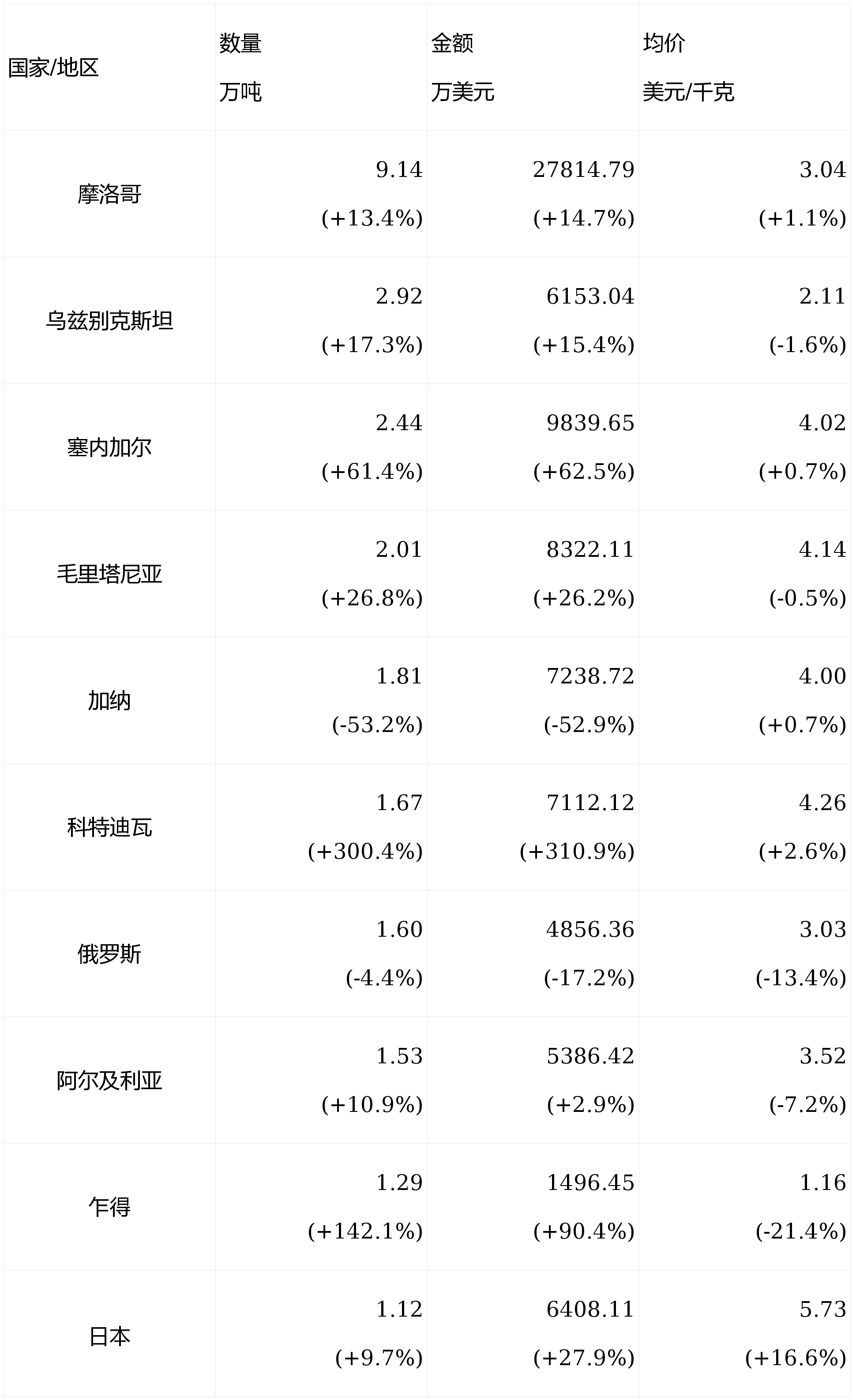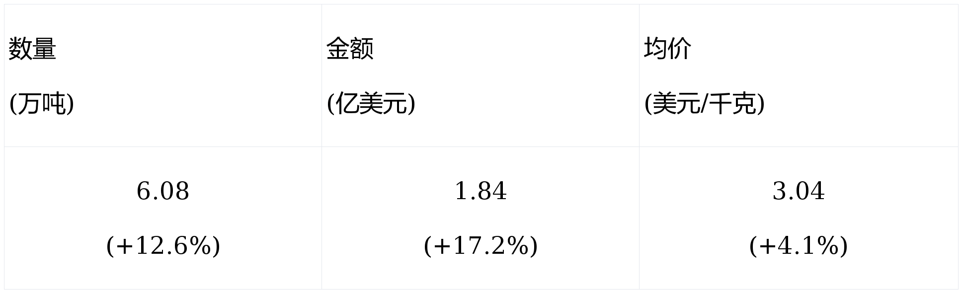 ,同比区分拉长11.9%和拉长8.9%,均价3.69美元/千克,同比低落2.7%。