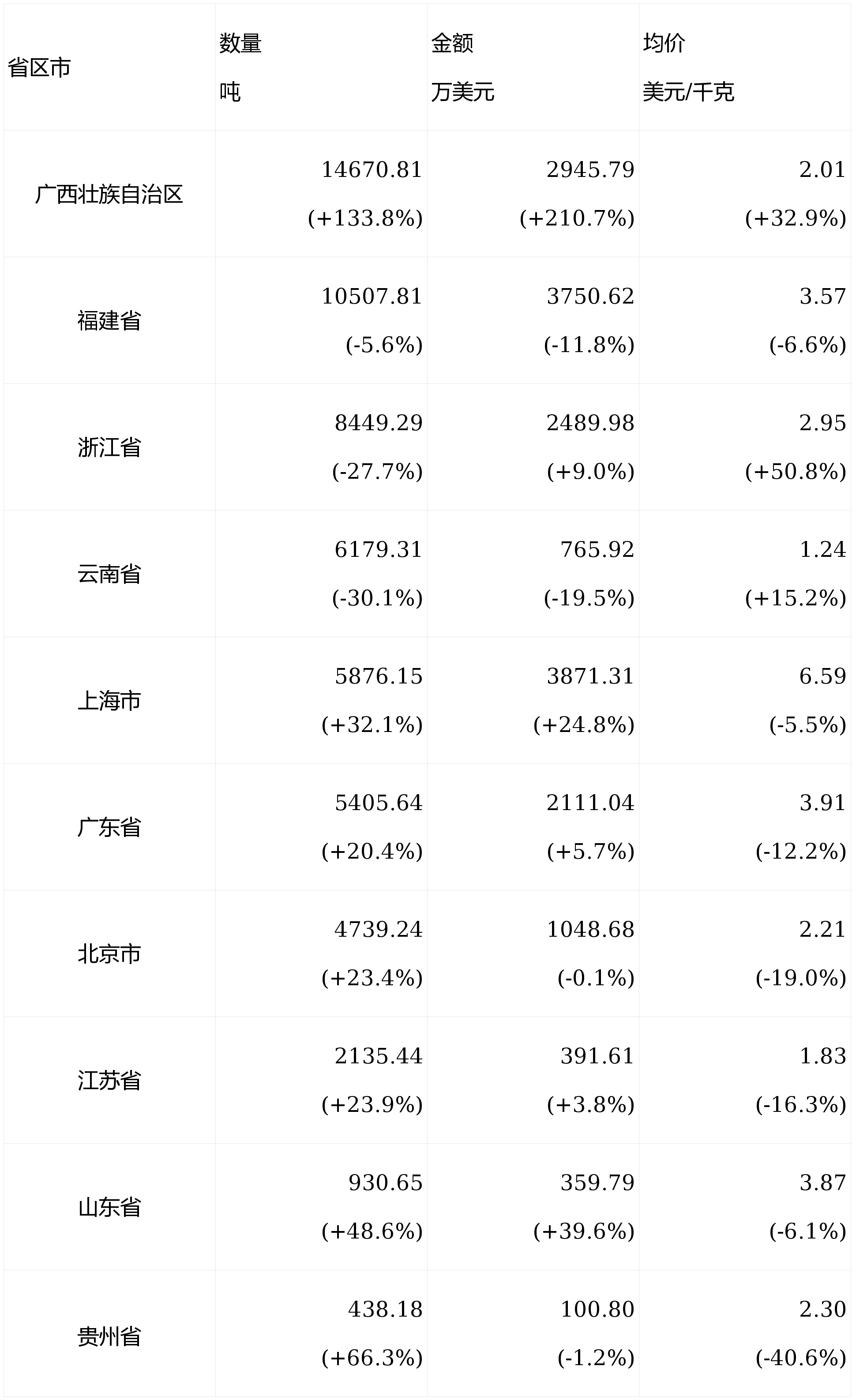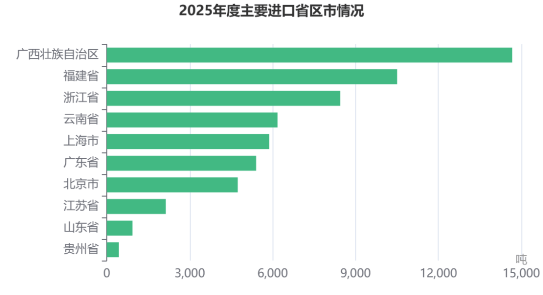 茶叶进口省区市位居前10位的区分是广西壮族自治区、福修省、浙江省、云南省、上海市、广东省、北京市、江苏省、山东省、贵州省。广西壮族自治区进口量(14670.81吨)、金额(2945.79万美元)同比增幅最大,区分达133.8%和210.7%;云南省进口量(6179.31吨)和进口额(765.92万美元)同比降幅最大,区分达30.1%和19.5%。