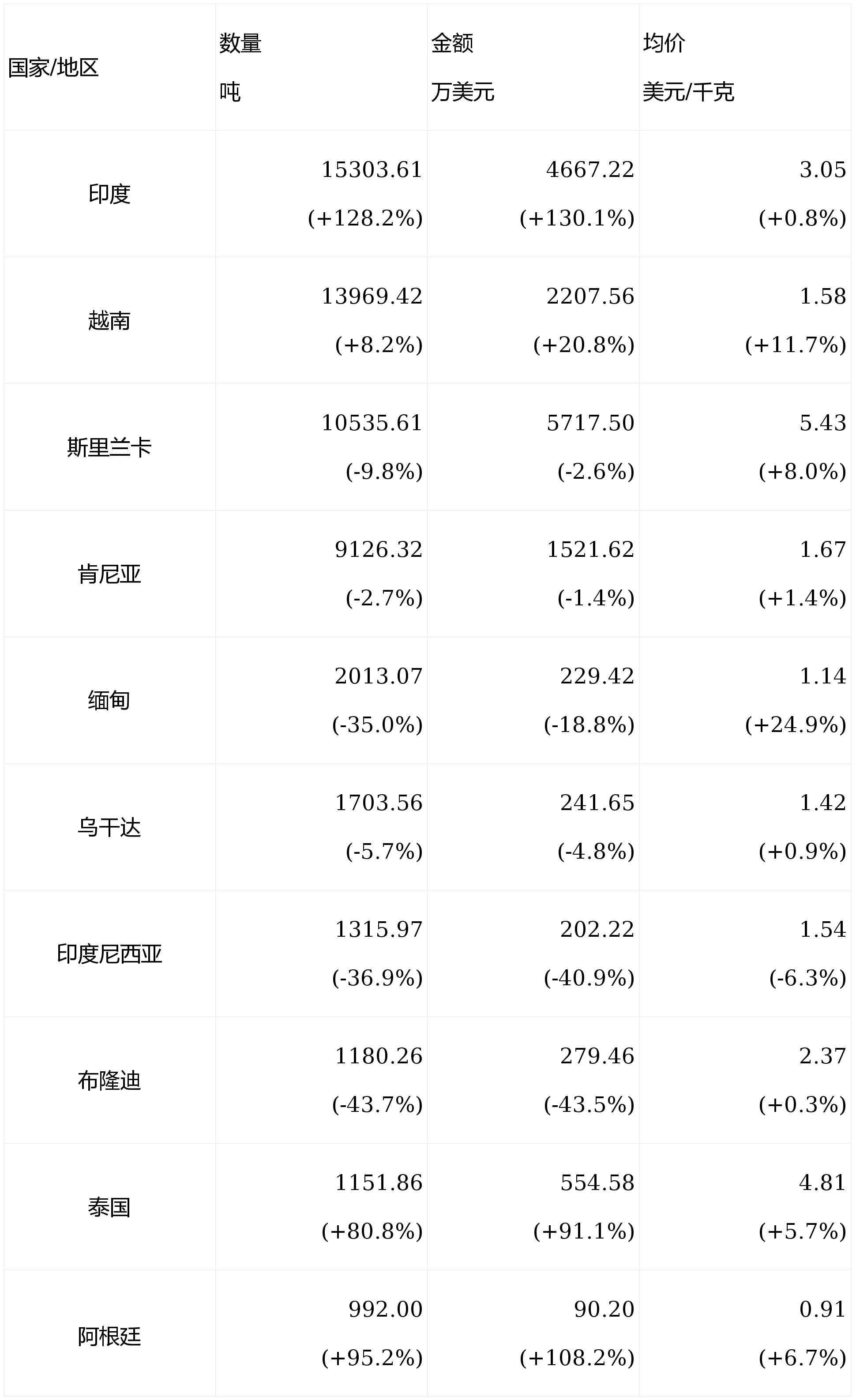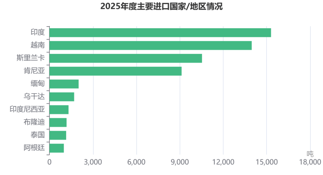 茶叶进口墟市位居前10位的区分是印度、越南、斯里兰卡、肯尼亚、缅甸、乌干达、印度尼西亚、布隆迪、泰邦、阿根廷。从印度进口量(15303.61吨)、金额(4667.22万美元)同比增幅最大,区分达128.2%和130.1%;从布隆迪进口量(1180.26吨)和进口额(279.46万美元)同比降幅最大,区分达43.7%和43.5%。