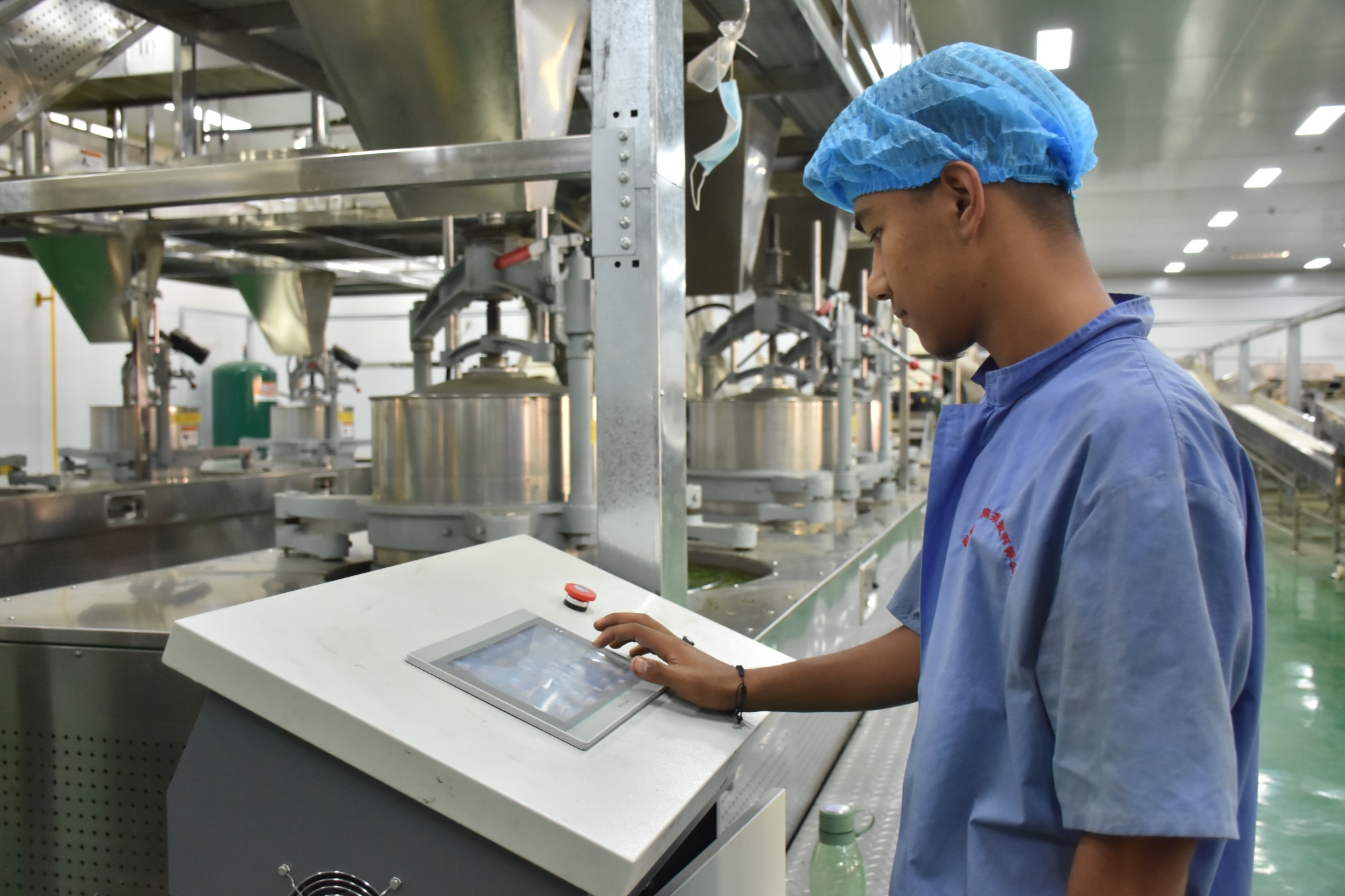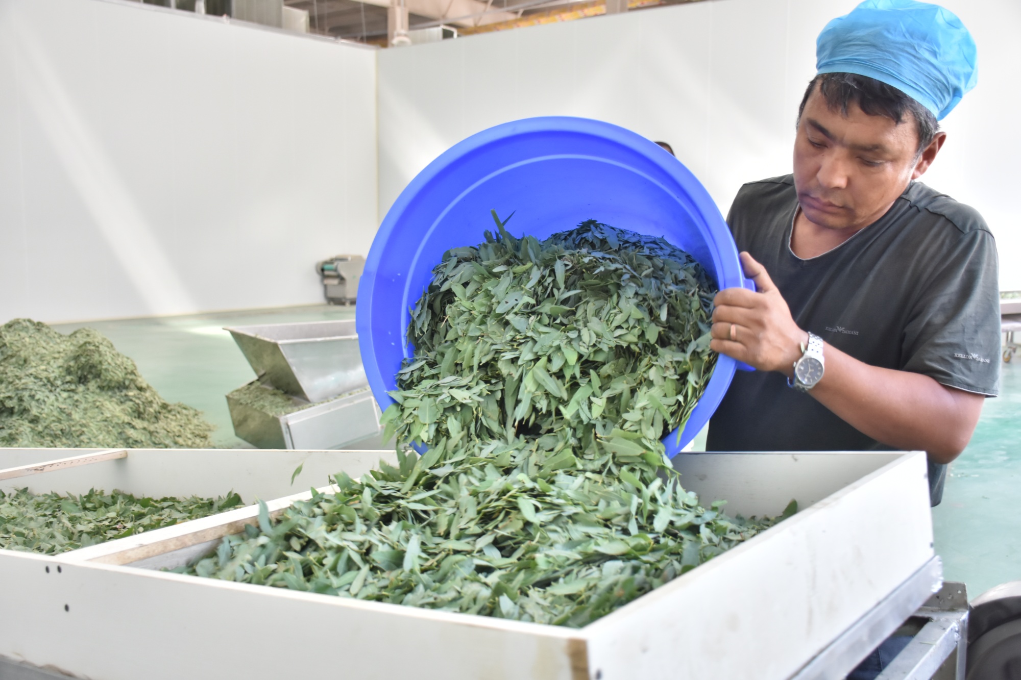 尉犁县罗布麻茶蜜有限公司职责职员通过振动筛挑选优质罗布麻叶子 (刘佳 摄)